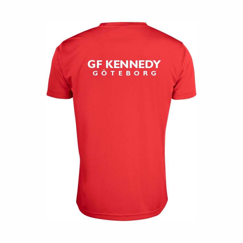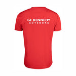 Röd funktions t-shirt med vitt ryggtryck. För medlemmar och supportrar till GF Kennedy. Plagget är tillverkat med spun dyed-teknik, där färgpigment tillsätts direkt i textilfibern. Det minskar användningen av vatten och kemikalier, vilket gör produktionen mer miljövänlig än traditionell tillverkning, och ger samtidigt bättre färgdjup och färgbeständighet.