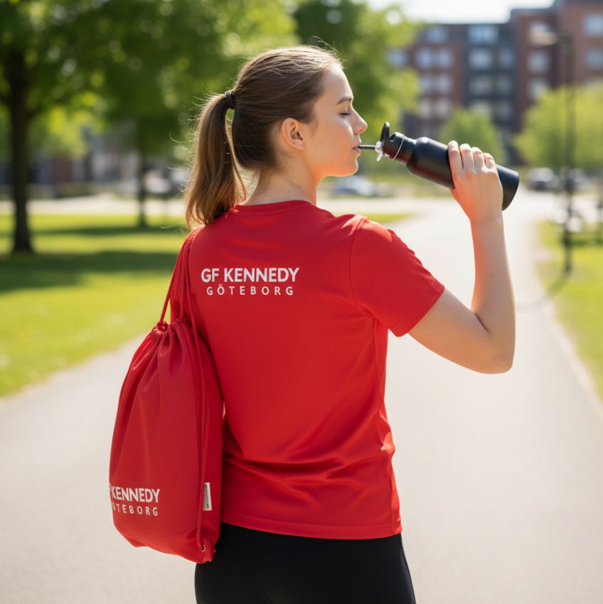 GF Kennedy-kit med T-shirt, tygpåse och vattenflaska.